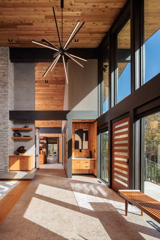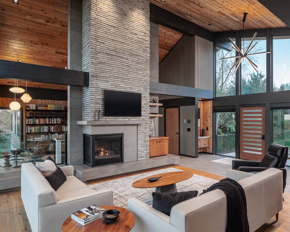 The approach winds through the forest, offering only glimpses of the structure. Upon arrival, the parking area is subtly positioned below the main level, reinforcing the sense of discovery. As one ascends the entry walk, the house unfolds, revealing a dramatic view through the two-story living space, anchored by a stone fireplace that extends from floor to ceiling. The asymmetrical roofline lifts upward, accentuating the openness and maximizing natural light.