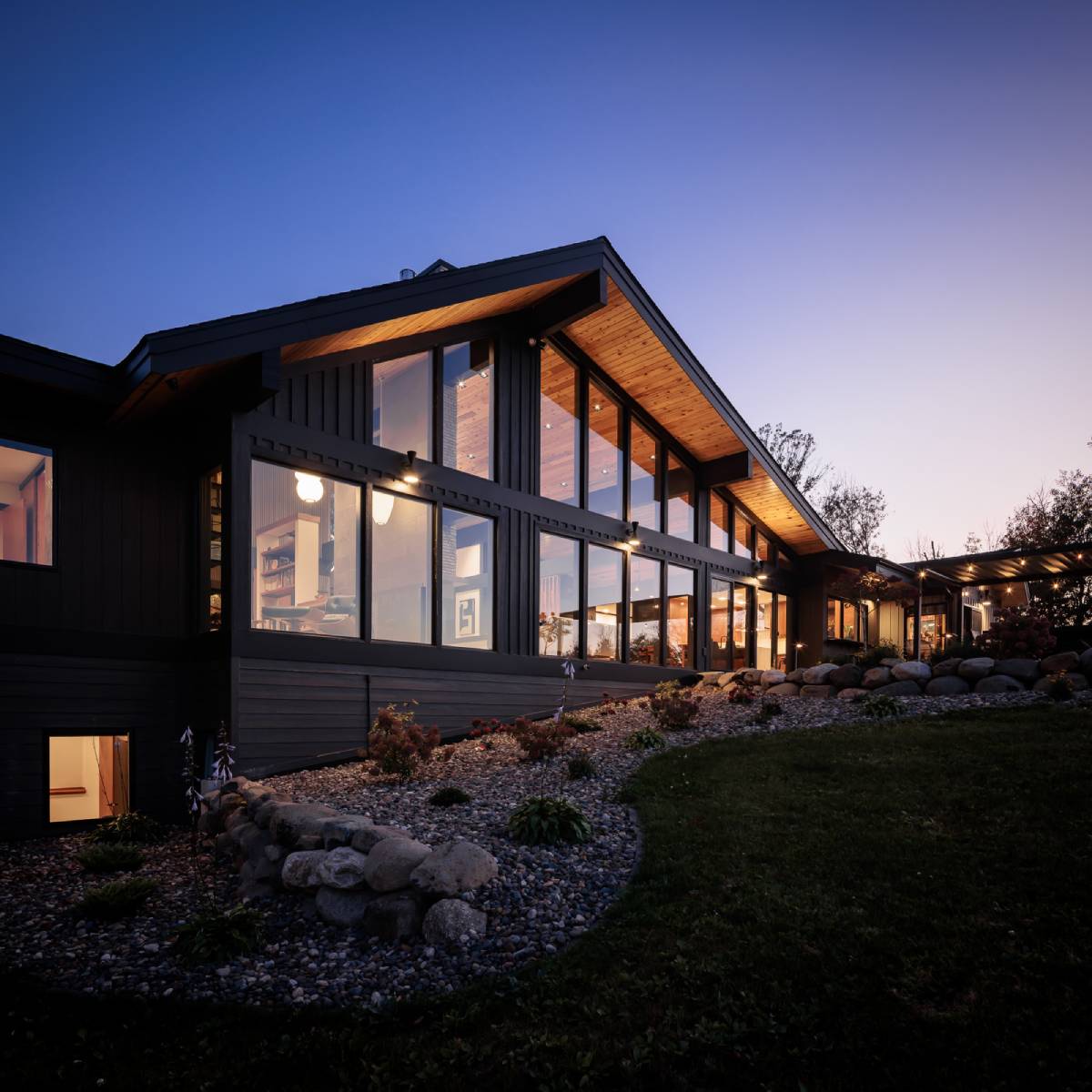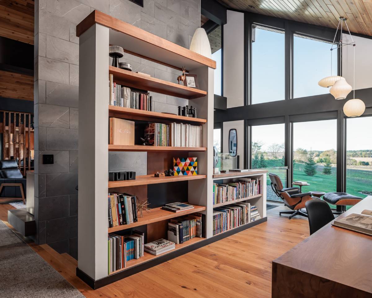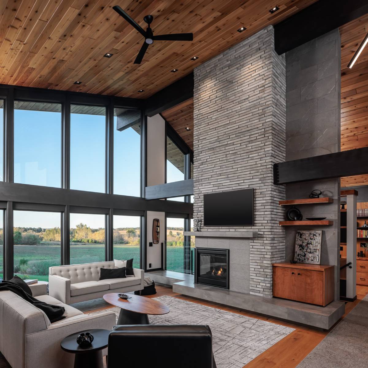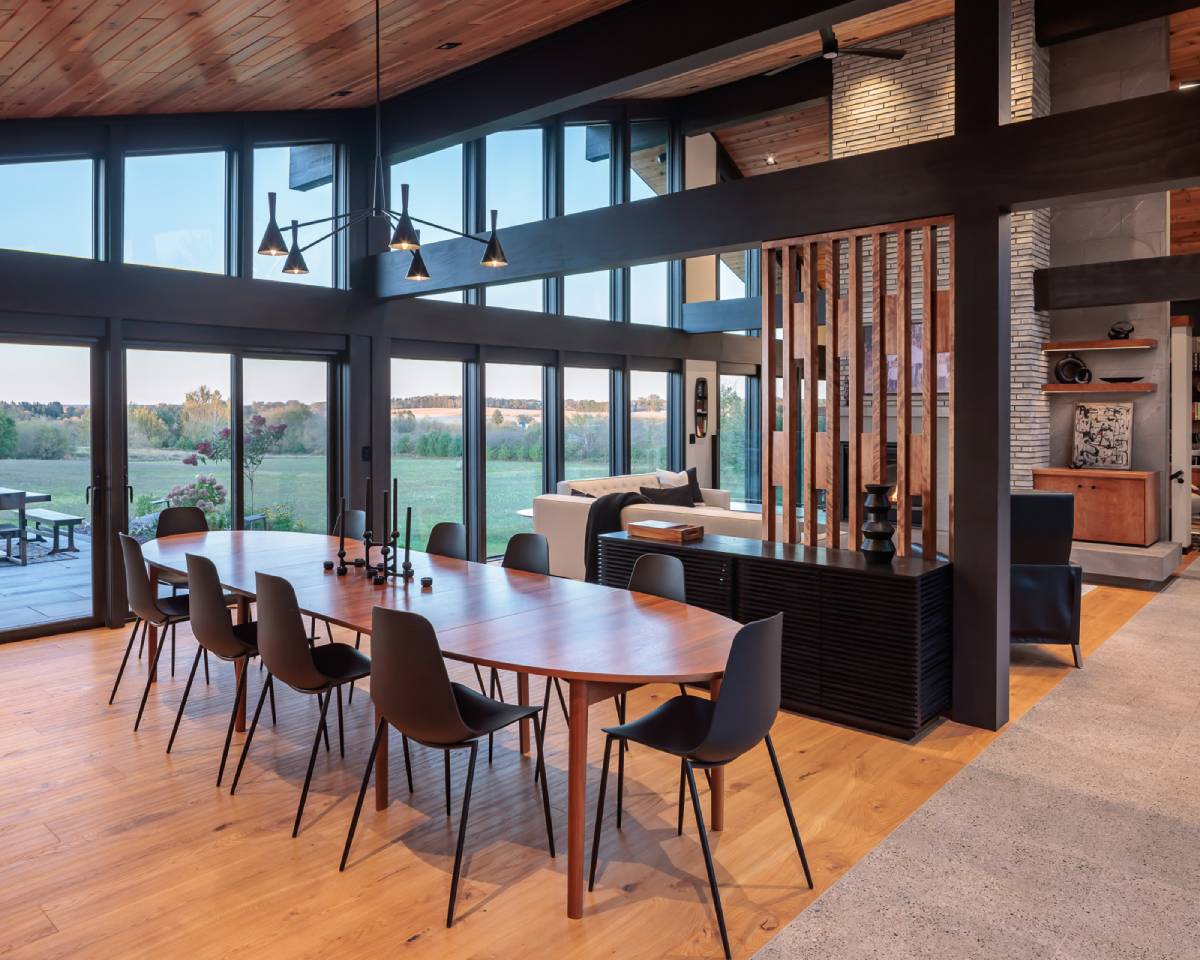 Project Description: Perched on a ridge at the edge of a wooded expanse, this mid-century modern home was designed to embrace both the intimate connection to the forest and the expansive valley views beyond. The site—carefully chosen from the family’s 52-acre homestead in western Wisconsin—balances privacy and openness, placing the home at the meeting point of dense trees and rolling fields.