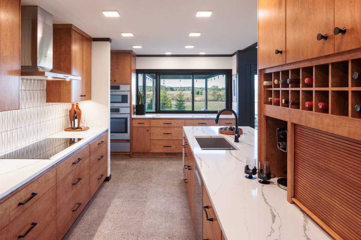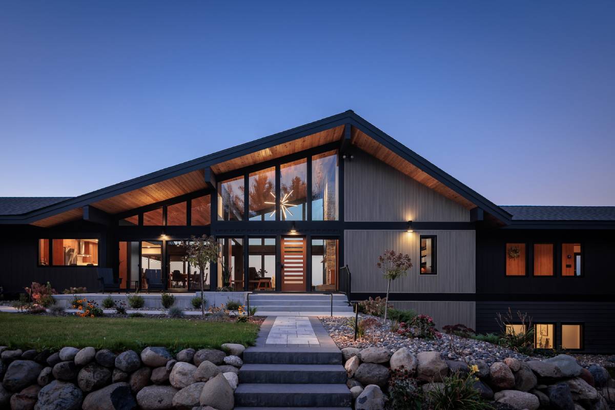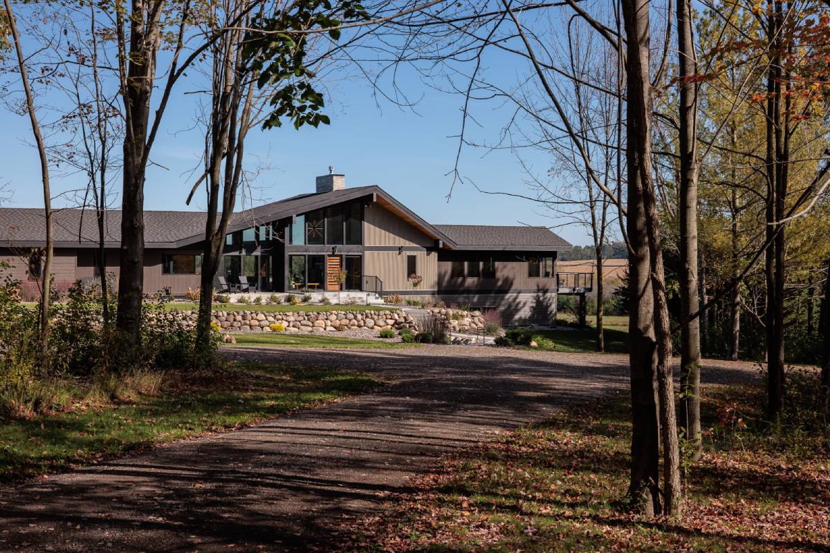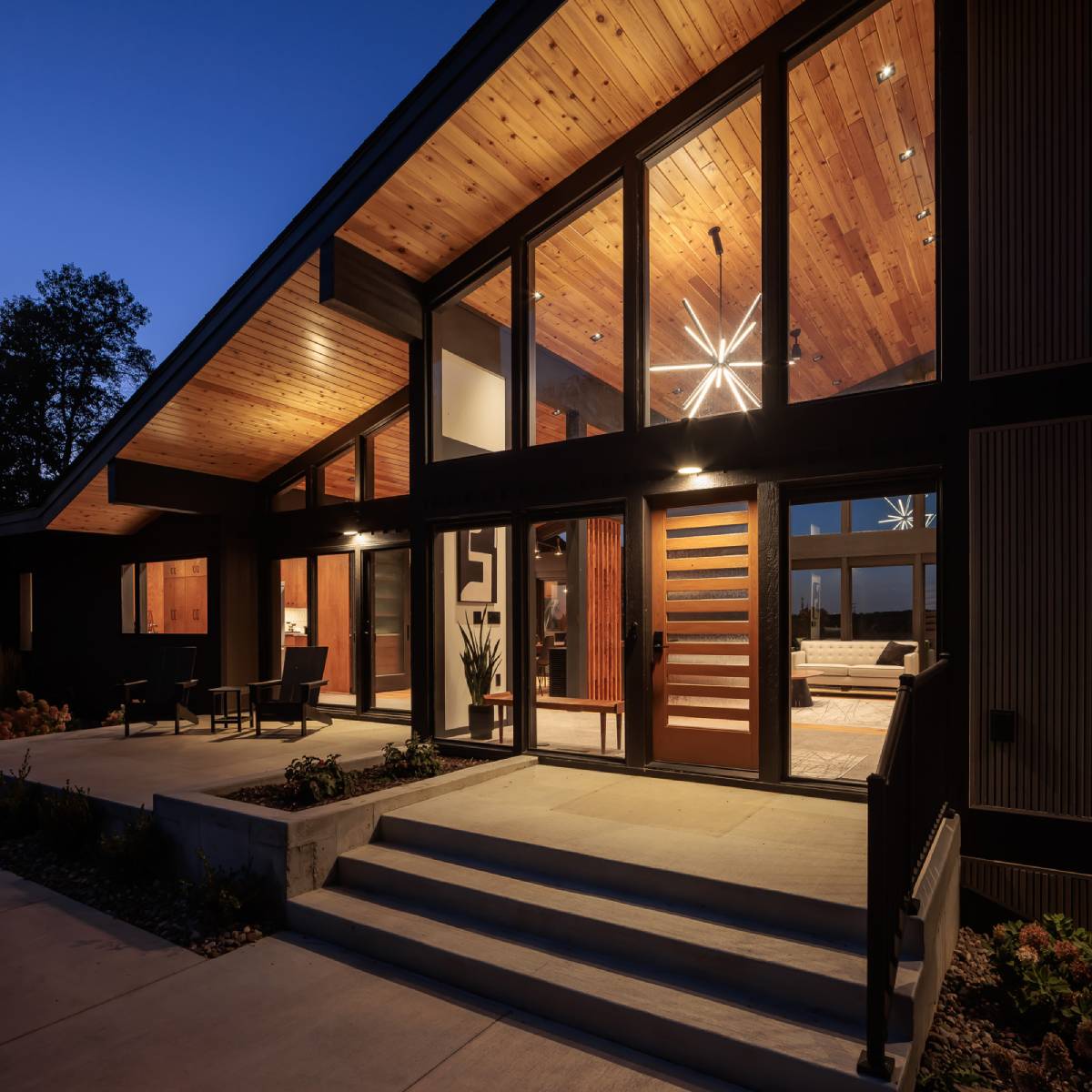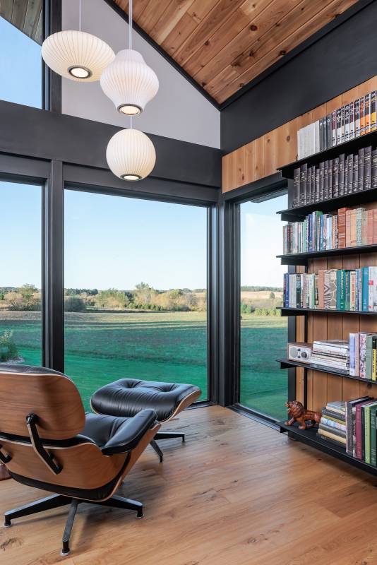 Project Description: Perched on a ridge at the edge of a wooded expanse, this mid-century modern home was designed to embrace both the intimate connection to the forest and the expansive valley views beyond. The site—carefully chosen from the family’s 52-acre homestead in western Wisconsin—balances privacy and openness, placing the home at the meeting point of dense trees and rolling fields.