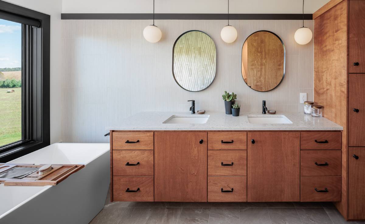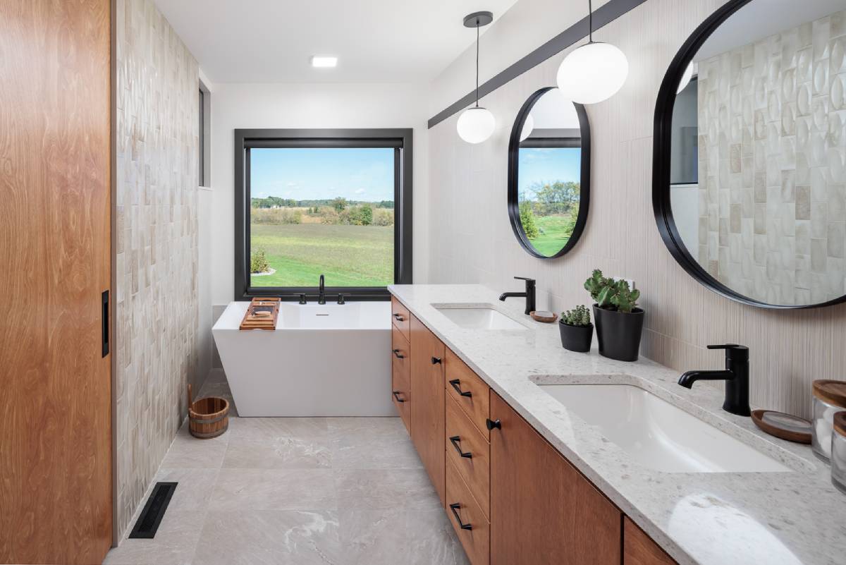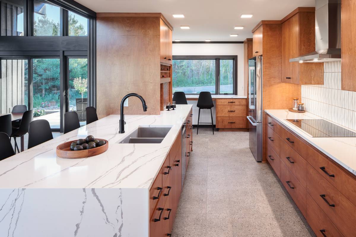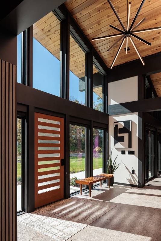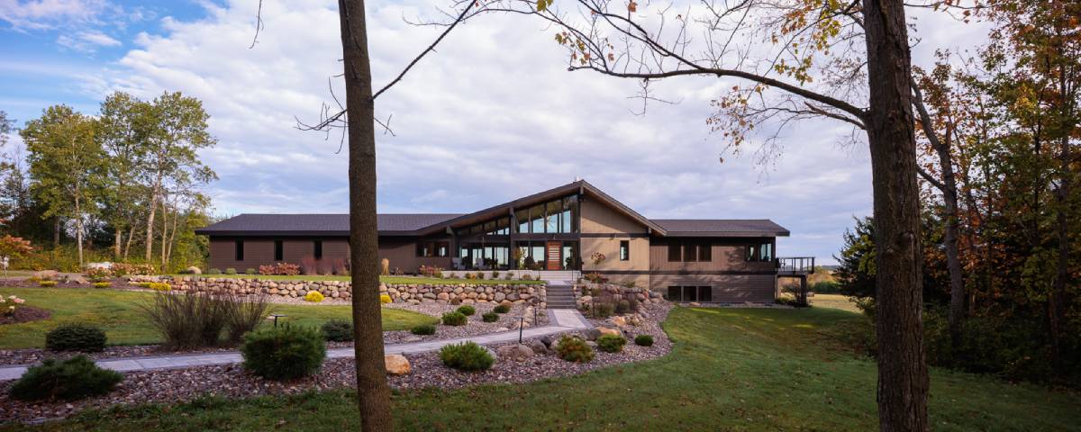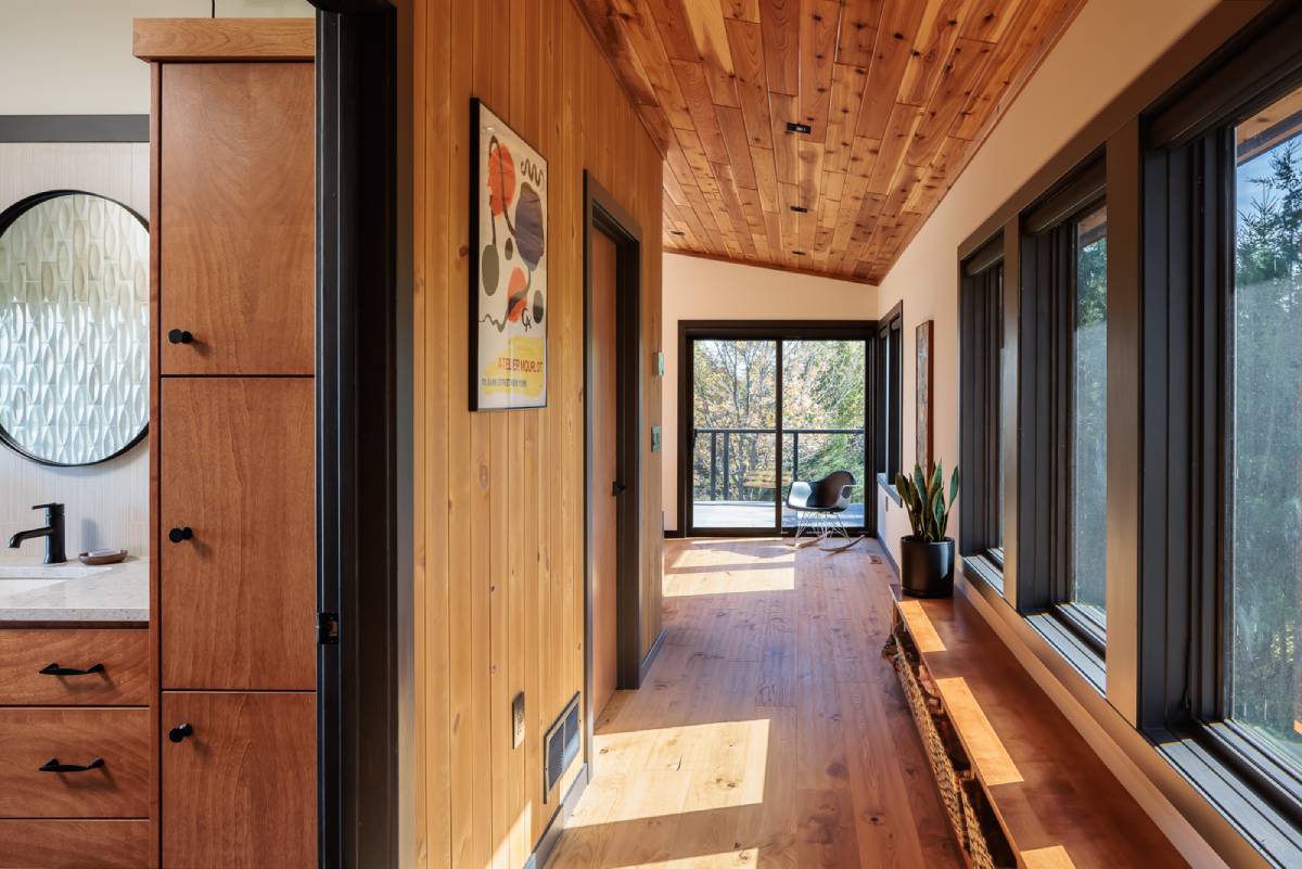Project Description: Perched on a ridge at the edge of a wooded expanse, this mid-century modern home was designed to embrace both the intimate connection to the forest and the expansive valley views beyond. The site—carefully chosen from the family’s 52-acre homestead in western Wisconsin—balances privacy and openness, placing the home at the meeting point of dense trees and rolling fields.