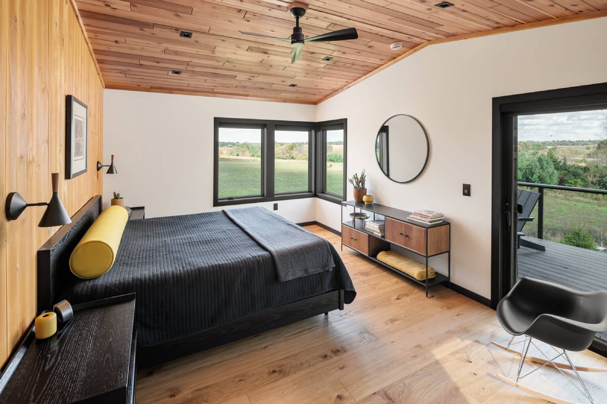 Perched on a ridge at the edge of a wooded expanse, this mid-century modern home was designed to embrace both the intimate connection to the forest and the expansive valley views beyond. The site—carefully chosen from the family’s 52-acre homestead in western Wisconsin—balances privacy and openness, placing the home at the meeting point of dense trees and rolling fields.