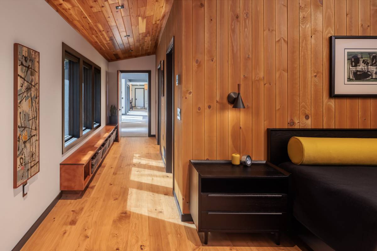 To the east, the central fireplace marks the transition to more intimate spaces. A wide stair, integrated with the hearth, leads to the lower level, while a library with a corner window creates a quiet retreat, perfect for reading and taking in the valley beyond. The primary suite extends off this wing, featuring a spa-like bath with a textured tile walk-in shower, a soaking tub positioned for dramatic views, and a private balcony overlooking the landscape.