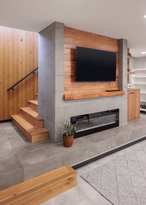 The lower level is designed for family gatherings and extended stays. A secondary fireplace, echoing the materials of the main level, anchors a cozy living area with an adjacent kitchenette. Additional bedrooms and baths provide ample accommodations, while a hidden playhouse under the stair and a dedicated bunk room add playful touches for visiting grandchildren.