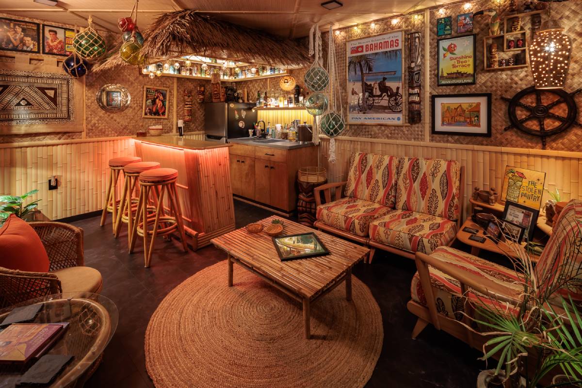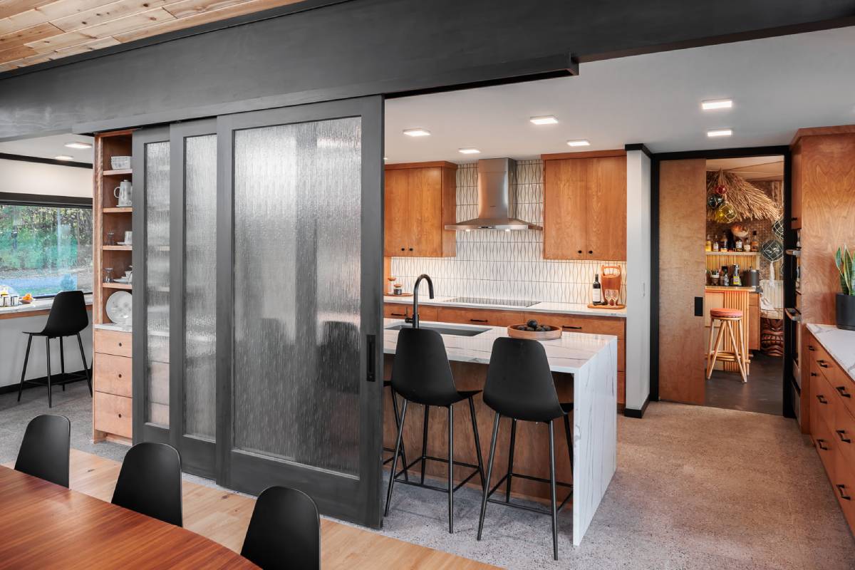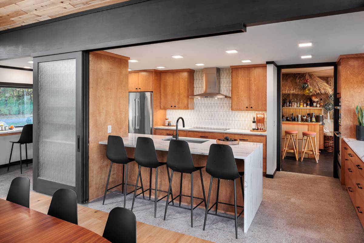 Inside, warm materials define the interiors. Wood ceilings and floors, complemented by concrete-look tile, establish a natural, grounded aesthetic. Black wood-clad beams provide scale and structure, subtly delineating spaces within the open-plan layout. A wood lattice screen partially conceals the dining area from the foyer, offering both openness and privacy. The kitchen—designed for gathering—features a large island, a dedicated baking station, and a breakfast counter that catches morning light while serving as a pass-through to the adjacent patio. Two textured glass sliding panels allow the kitchen to be closed off when needed. Just beyond, a hidden gem: the home’s personal Tiki room, complete with a vintage mug collection and a full bar.